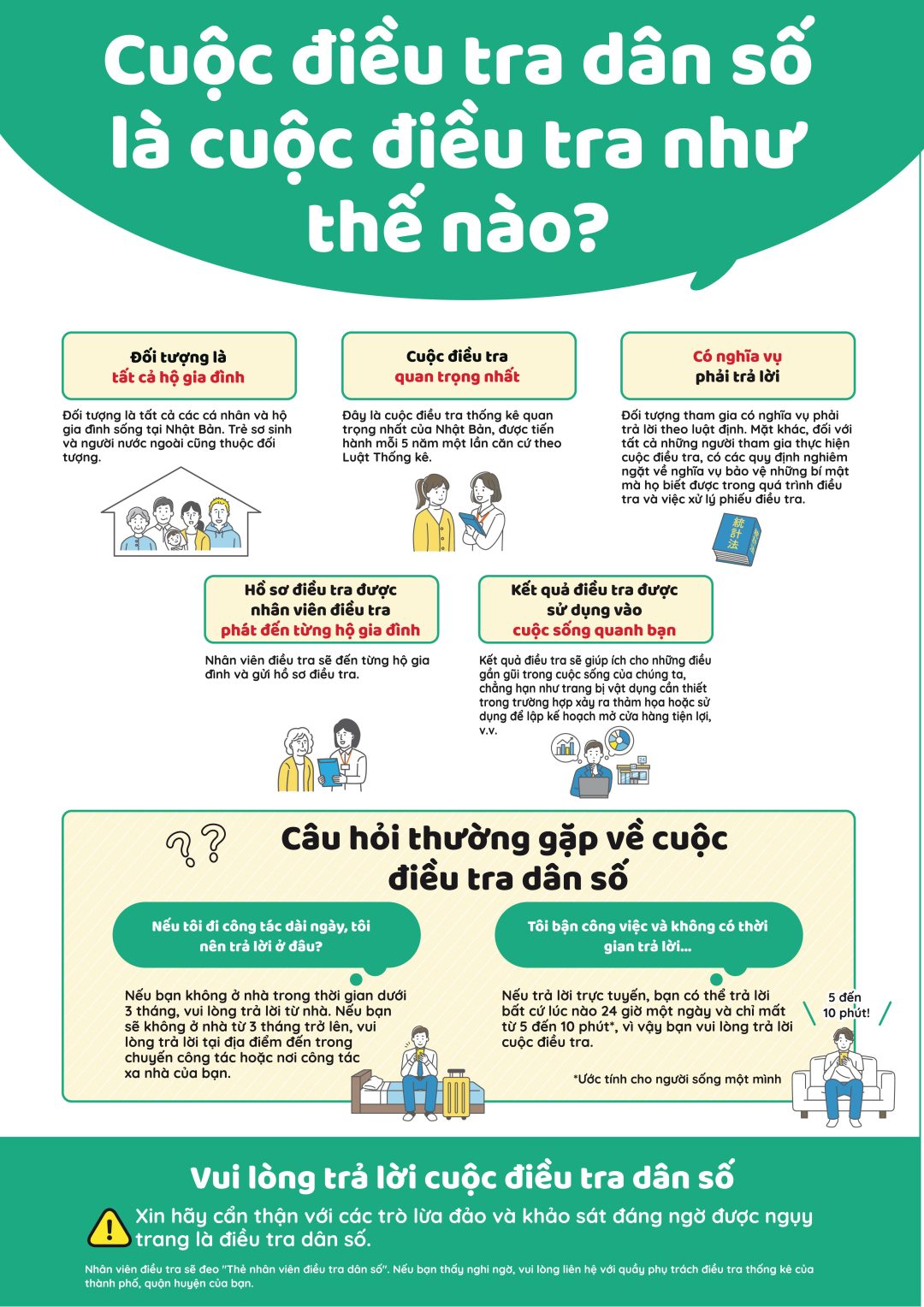 Điều tra dân số là cuộc khảo sát thống kê quan trọng nhất được tiến hành 5 năm một lần. Kết quả điều tra dân số được sử dụng để thực hiện các biện pháp như xây dựng các thành phố thuận tiện cho người nước ngoài sinh sống, v.v. Đối tượng của cuộc điều tra dân số này những người đã sống ở Nhật Bản từ 3 tháng trở lên hoặc có kế hoạch sống ở Nhật Bản từ 3 tháng trở lên, bất kể quốc tịch. Đối tượng của cuộc điều tra có nghĩa vụ phải trả lời, vì vậy hãy vui lòng chắc chắn trả lời. Vui lòng trả lời chậm nhất là ngày 8 tháng 10 (Thứ Tư).