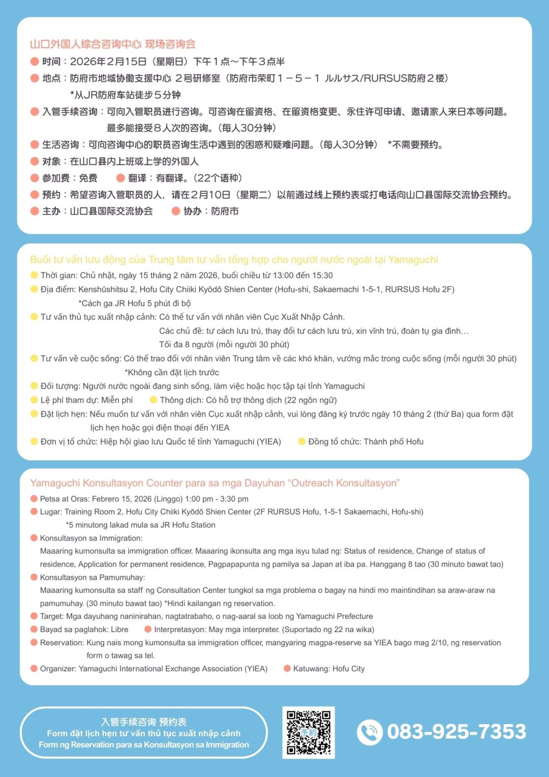 【预约】希望咨询入管职员的人,请在2月10日(星期二)以前通过线上预约表( https://forms.office.com/r/CHGUbiiCCk )或打电话( 083-925-7353 )向山口县国际交流协会预约。