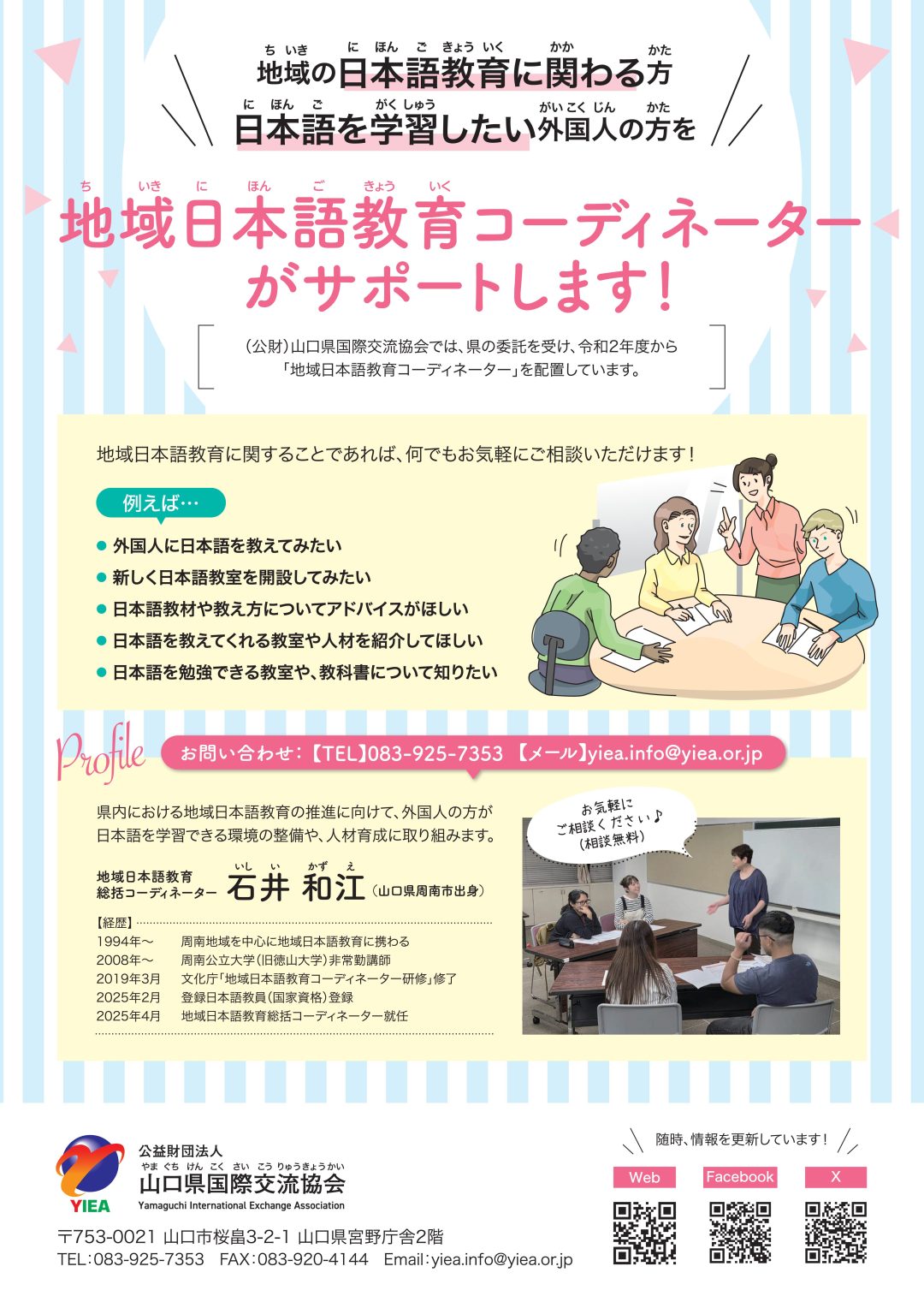 地域日本語教育コーディネーターをご活用ください! 公開日:2025年12月03日 協会からのお知らせ ツイート (公財)山口県国際交流協会では、県からの委託により、協会内に「地域日本語教育コーディネータ―」を配置しています。 外国人住民への日本語学習支援に関心のある方や、日本語を勉強したい外国人の方など、地域日本語教育について、石井総括コーディネーターまでお気軽にご相談ください。 一覧に戻る