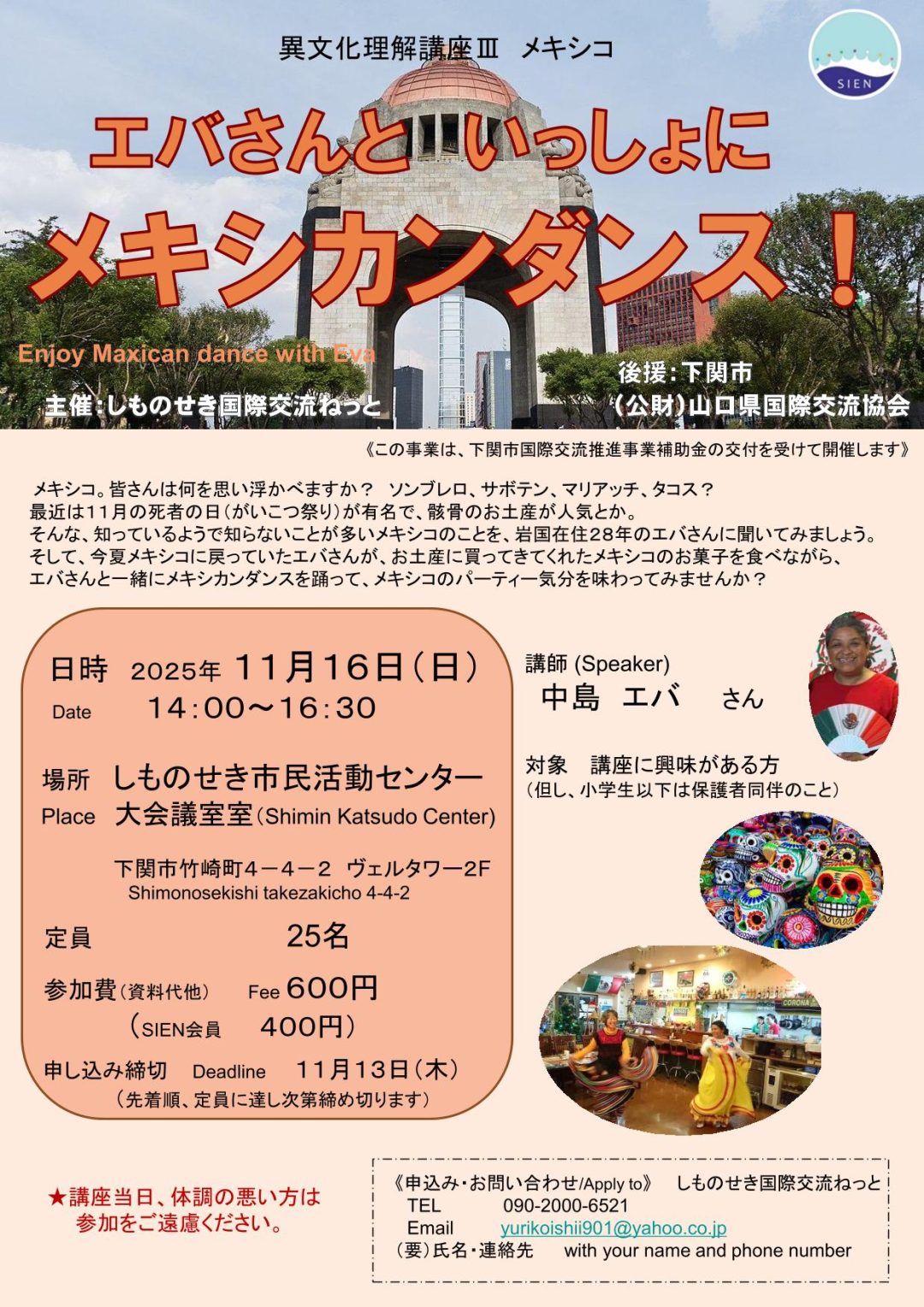 しものせき国際交流ねっとより、異文化理解講座Ⅲ メキシコ 「エバさんといっしょにメキシカンダンス!」開催のお知らせです。