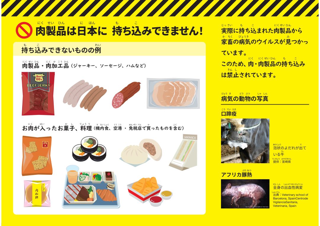 これら伝染病のウイルスは肉製品等を介して運ばれることがあるので、日本に病気が侵入するのを防ぐため、海外からのほとんどの肉製品は持込みが制限されています。