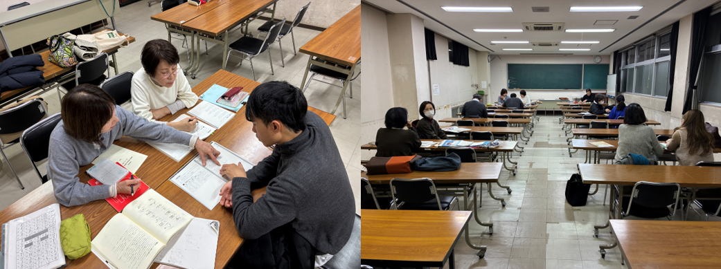教室に来ると、まずはマッチング担当のスタッフにより、手際よくペア(グループ)に分けられていきます。席についたら、スムーズに学習が始まります。4か国6人、10代から70代、主婦・技能実習生・学生、多様な背景を持つ外国人学習者が、漢字・試験対策・文法等々、必要に応じた内容で勉強します。記述があればその都度確認をしたり、質問が出ればその場で説明があったり、学習者のペースに合わせた細やかな対応がされていました。テキストもいろいろ準備されていて、どんな学習者が来ても受け入れられる体制も整っています。
